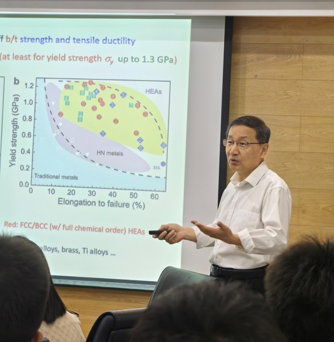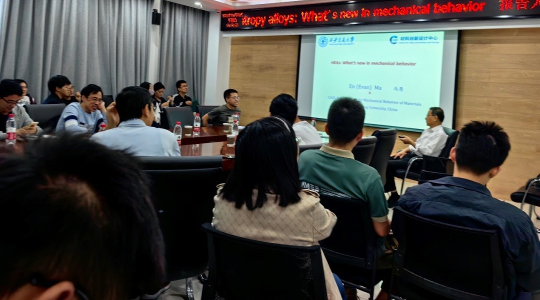 近年来涌现的高熵合金打破了传统的以单一主元为基础的合金设计理念,为材料力学性能调控提供了广阔的空间,在航天、国防等领域显示出重要应用前景。报告中,马恩教授通过10个问题循序渐进地阐述了高熵合金在原子尺度与传统合金的结构差异,在此基础上详细论述了这种结构差异为高熵合金赋予的微观尺度的变形机制特点,以及其在介观、宏观尺度的力学性能特点。在互动环节,马恩教授与在场师生围绕不同结构类型高熵合金的变形机制、高熵合金的化学局域有序结构特征、高熵合金的原子尺度结构表征等问题开展了近90分钟的热烈讨论。